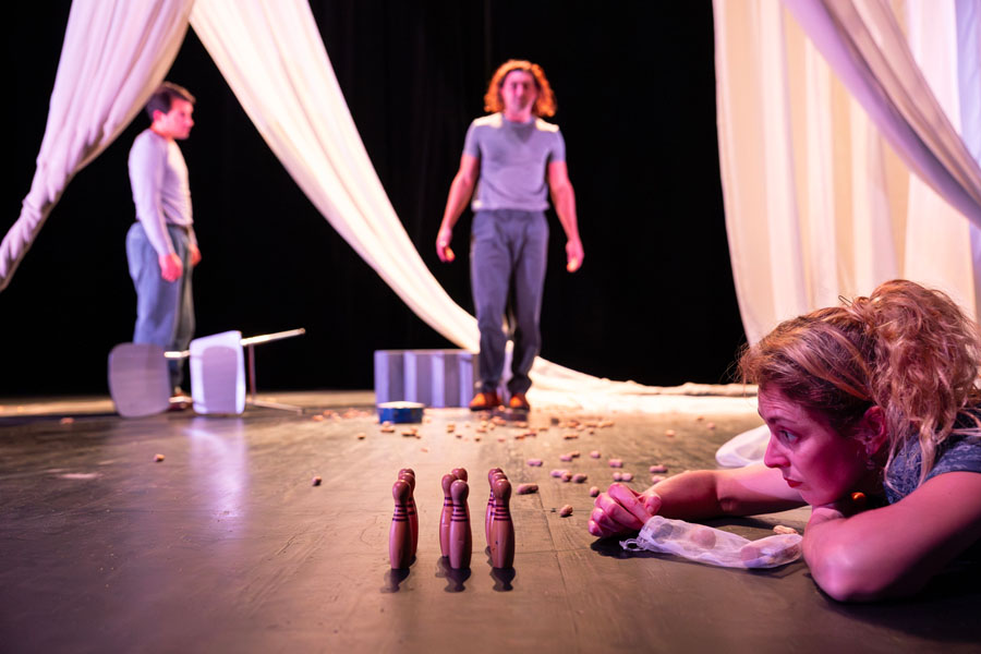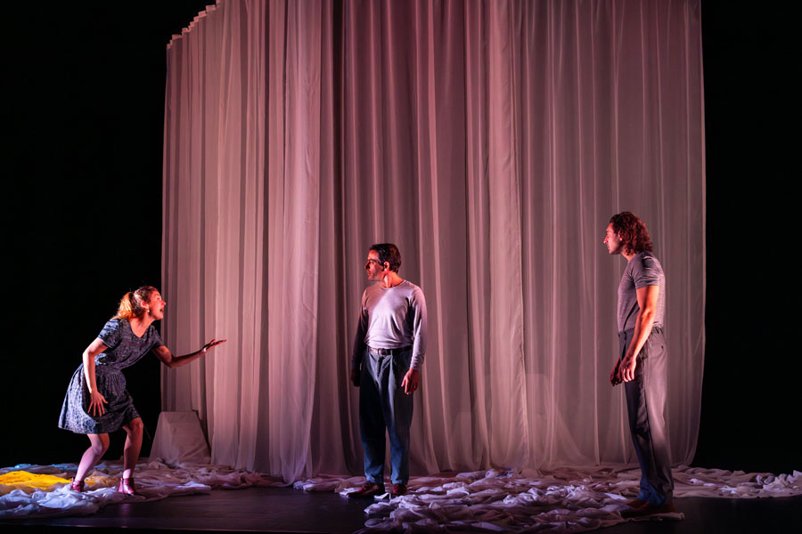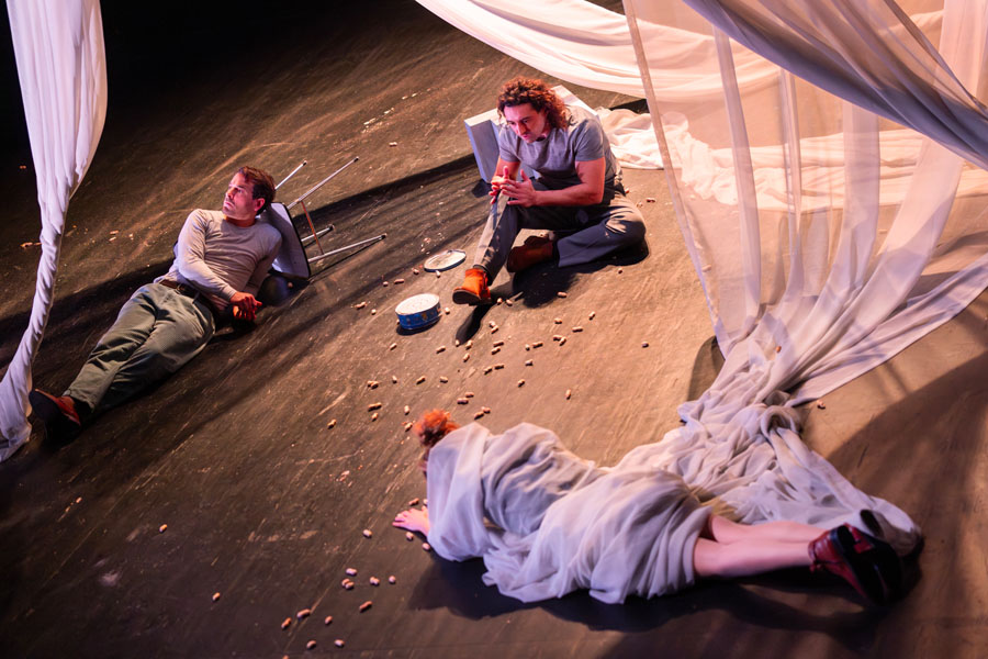 Avec ses brèches, ses silences et ses résonances, l’écriture atmosphérique de Guillaume Poix esquisse les espaces réels et imaginaires du souvenir. Catherine Javaloyès met en scène les joyeuses élucubrations mémorielles et votives d’une fratrie qui recule à tâtons, pistant le sentiment d’éternité dans la nostalgie bienheureuse des vestiges de l’enfance.